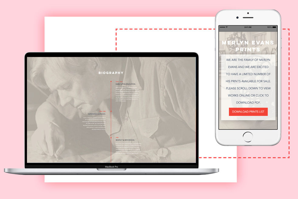 My online work includes the concept, design and launch of the website for the late artist Merlyn Evans. Starting with interviews and moving onto journey mapping, sketched wireframes and developmental mockups, I worked with the client to select colours, fonts, buttons and layout options that would sensitively present the artist’s work and information: www.merlynevans.co.uk